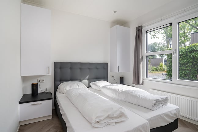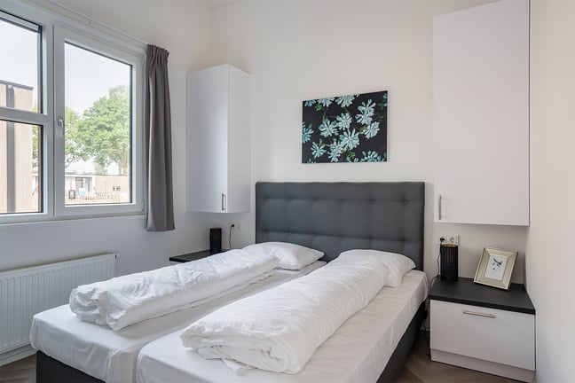 Kamer met privébadkamer en een tweepersoonsboxspring. Er is voldoende opbergruimte beschikbaar.
