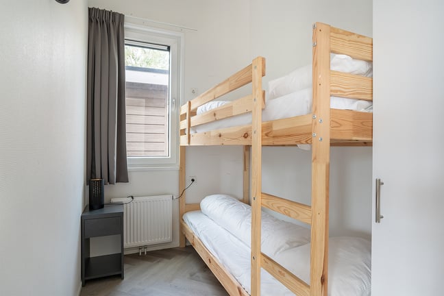 Een slaapkamer met stapelbed en opbergruimte, inclusief optie voor extra hekje om te voorkomen dat uw kind uit bed valt.